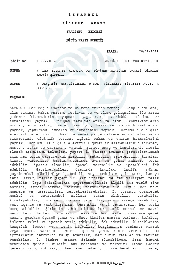 İstanbul Ticaret Odası Faaliyet Belgesi
